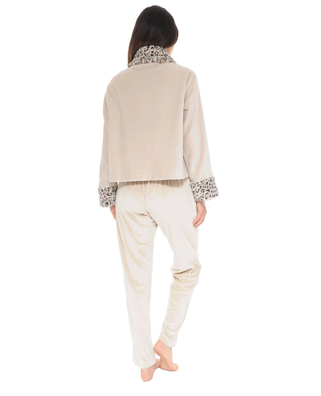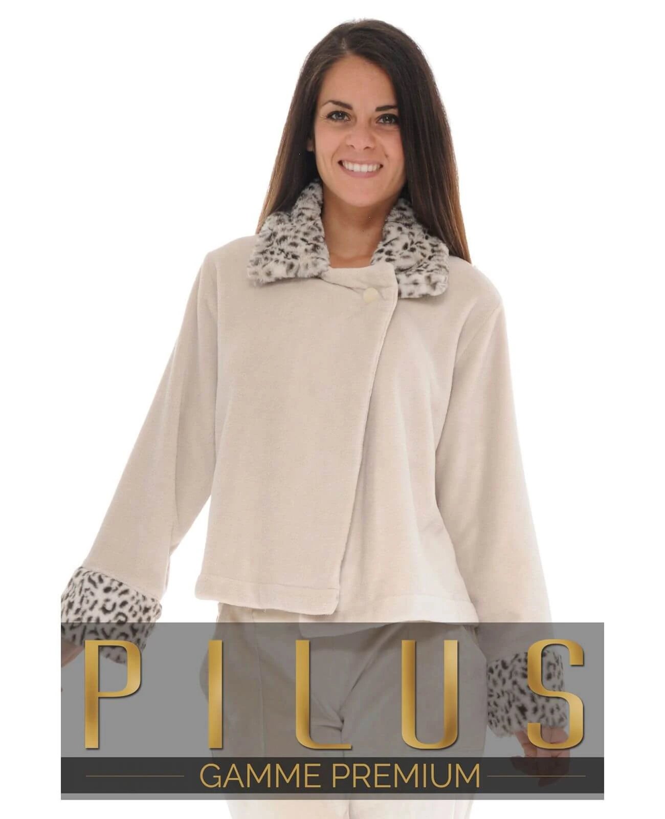 Le corps du modèle possède une couleur beige, et un motif lĂ©opard vient s’ajouter sur le bas des manches et le col qui lui donne un look fashion.