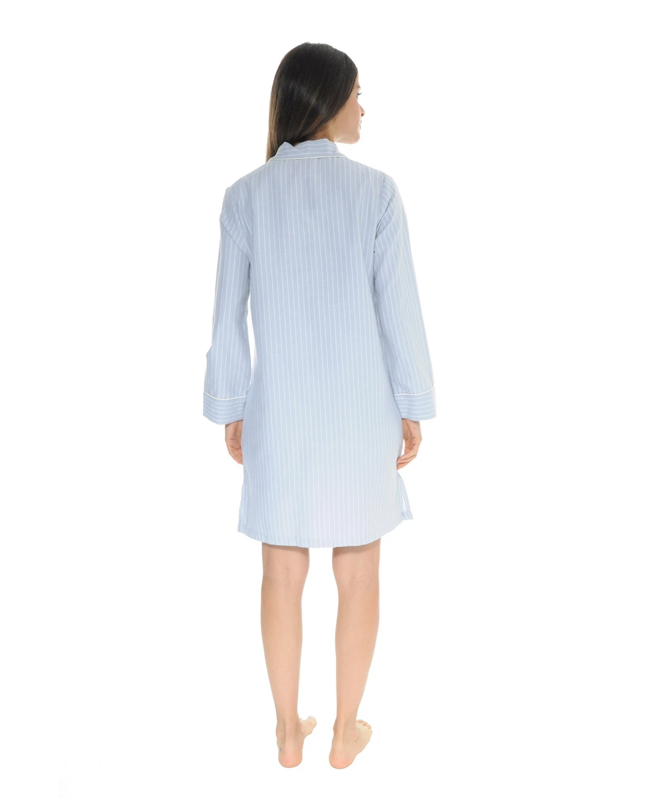 La marque PILUS est présente depuis plus de vingt ans sur les cinq continents dans les plus belles boutiques. Les belles matières, les finitions raffinées et les coupes impeccables, caractérisent cette gamme Premium. ! Une forme chic et élégante. Liquette, col chemisier, manches longues, entièrement boutonnée en popeline émerisée 100%coton appréciée pour son confort et sa chaleur. Des finitions soignées, un passepoil satin blanc souligne le col, la bande de boutonnage et le revers des manches. Cette chemise de nuit est déclinée dans un belle popeline rayée bleue sublimée par des boutons en nacre . Un modèle très élégant de 90cm avec fentes de côté.