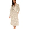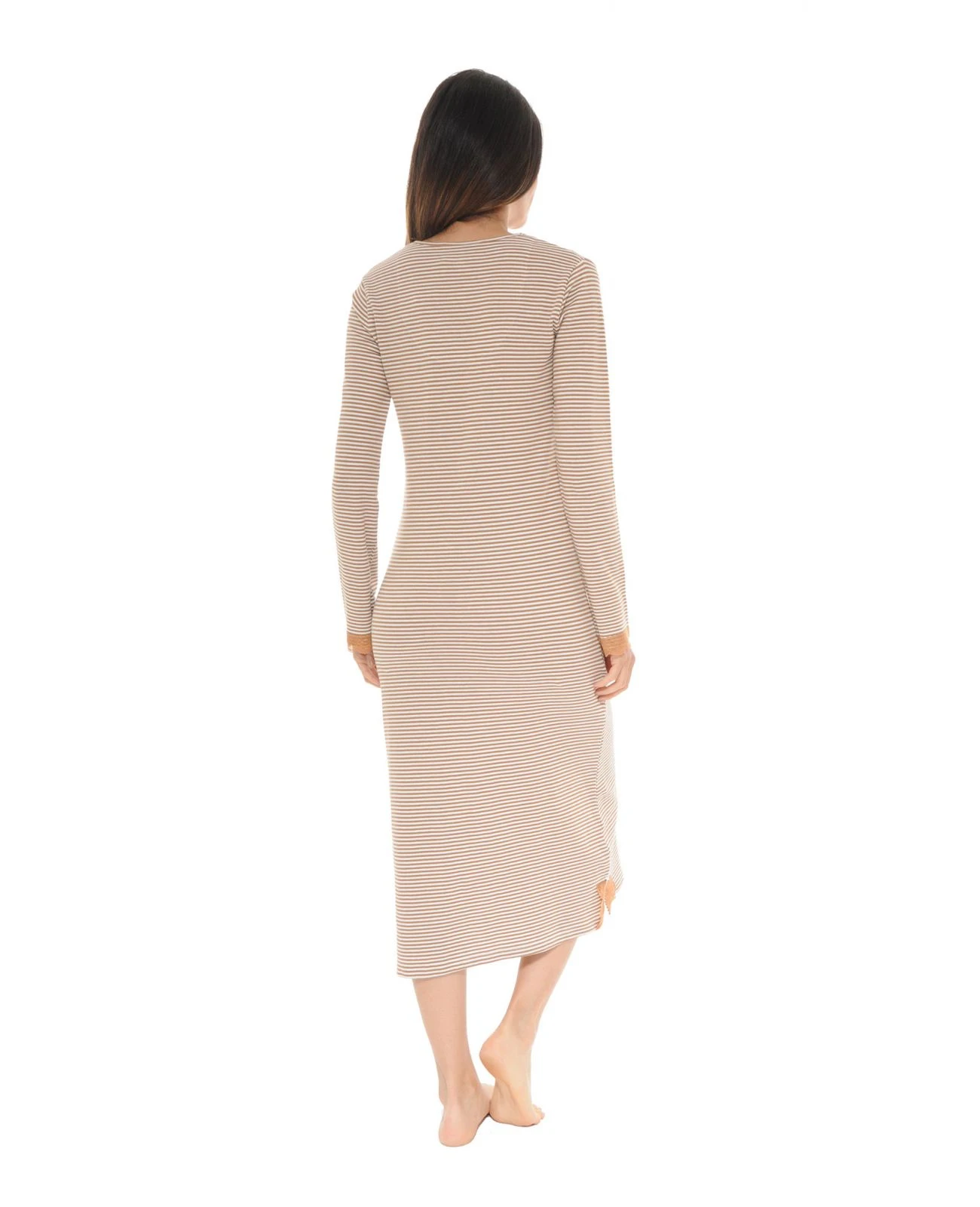ParĂ©e de rayures horizontales camel et blanche et d’un col V avec une ouverture de 3 boutons et bordĂ© d’une dentelle chic de couleur camel, cette chemise de nuit Ă la pointe de la mode est faite pour vous !