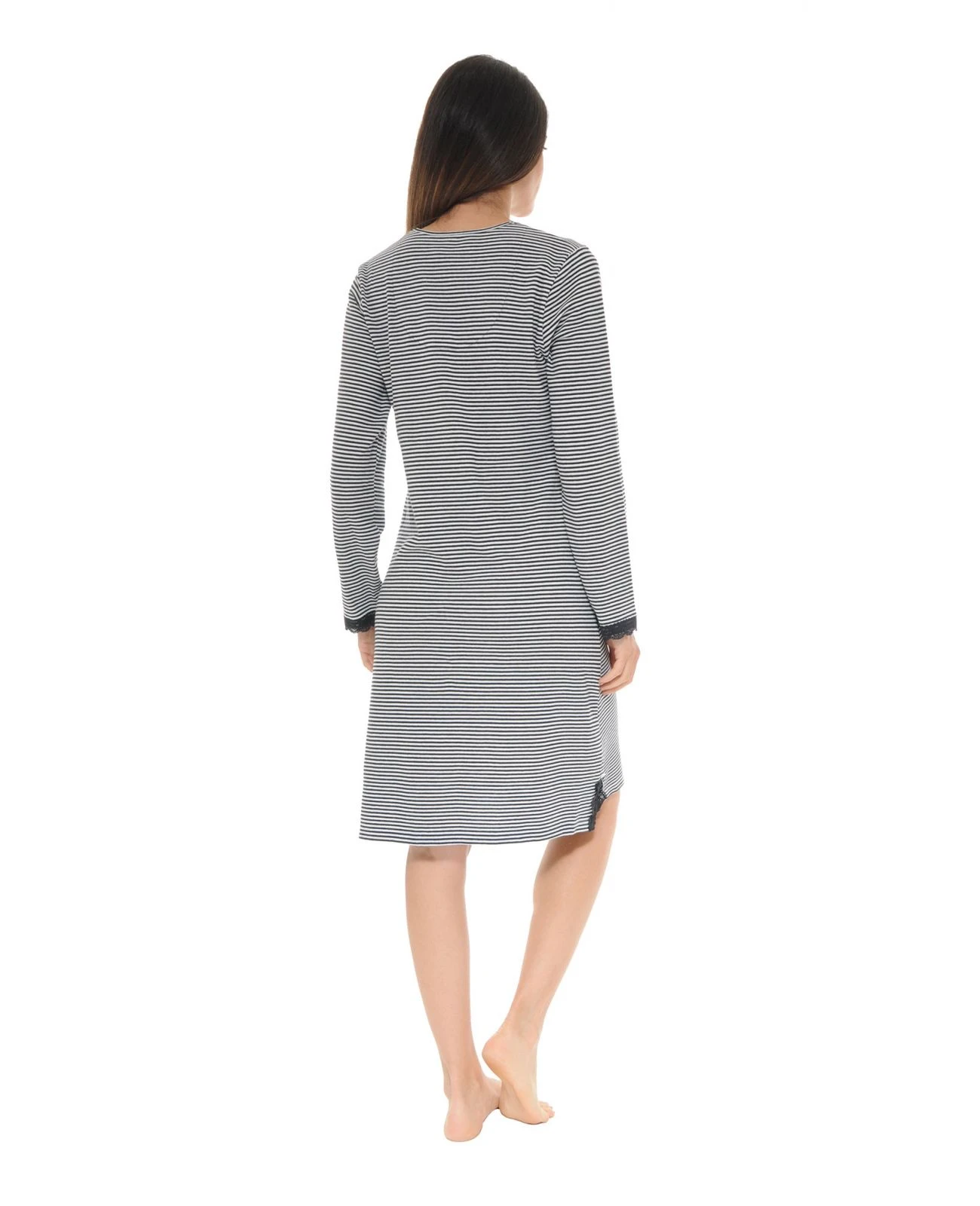 OrnĂ©e de rayures horizontales noir et blanche et d’un col V avec une ouverture de 3 boutons et bordĂ© d’une Ă©lĂ©gante dentelle couleur noir, cette chemise de nuit raffinĂ©e est faite pour vous !