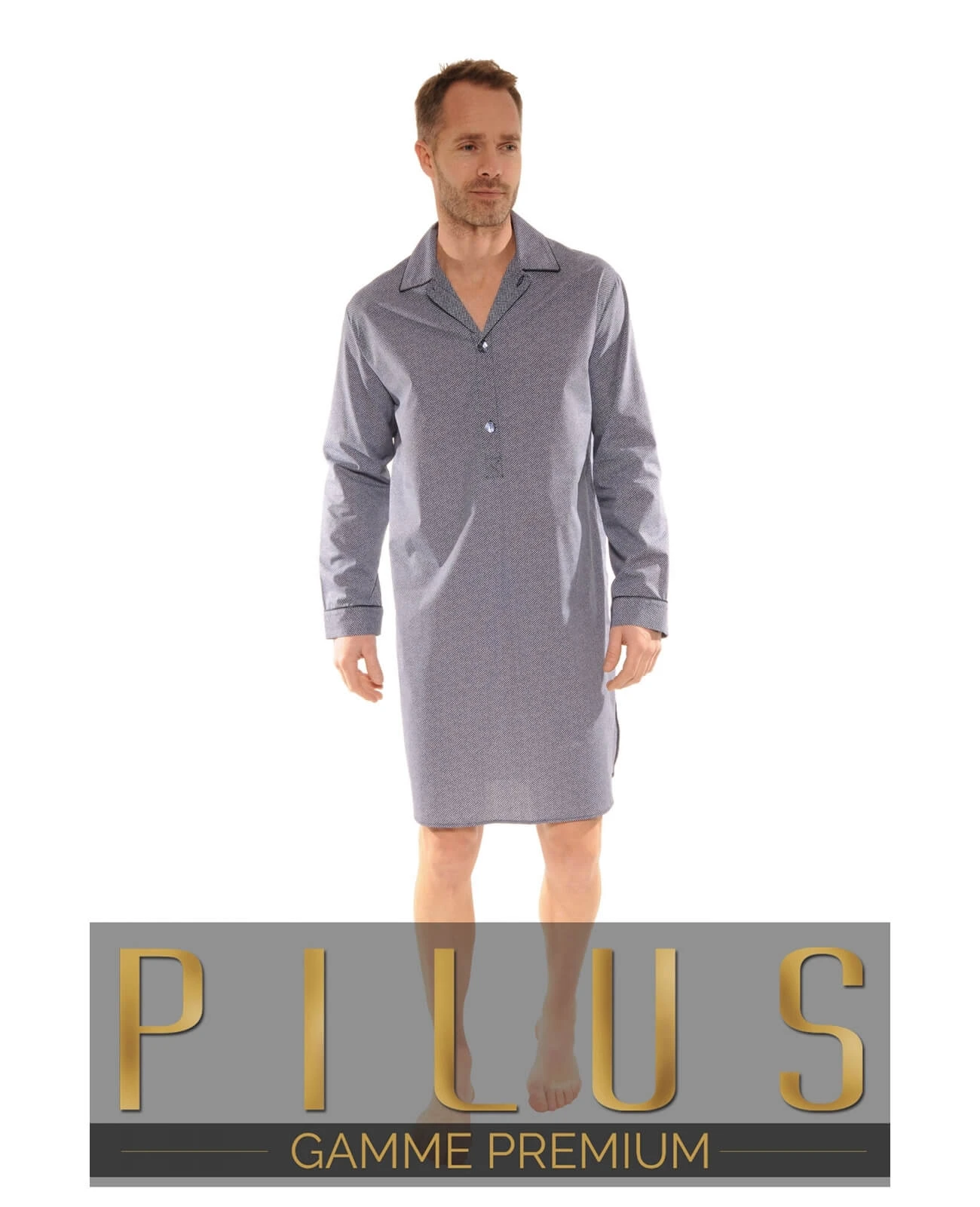 La marque PILUS est prĂ©sente depuis plus de vingt ans sur les cinq continents dans les plus belles boutiques. Les belles matiĂšres, les finitions raffinĂ©es et les coupes impeccables, caractĂ©risent cette gamme Premium. ! Liquette pour Homme encore appelĂ©e Chemise de nuit de « Grand PĂšre ». Forme chemise, col tailleur avec 3 boutons qui s’enfile par la tĂȘte, manches longues, en tissu 100% coton, lĂ©ger et agrĂ©able Ă porter dans un imprimĂ© marine blanc, un dessin de kaleidoscope original et chic. DĂ©tail du modĂšle, les fentes arrondies au bas de la chemise.