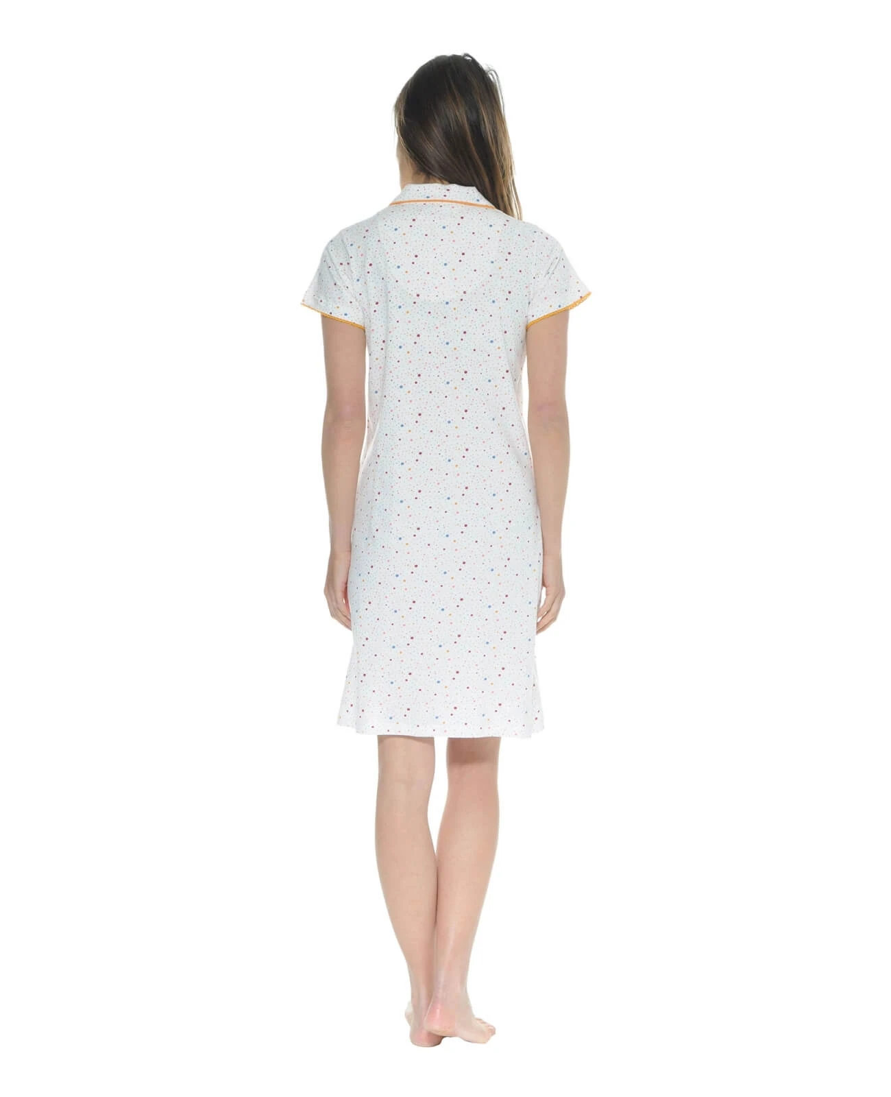 Chemise de nuit manches courtes, col chemisier, en maille jersey de pur coton, souple et confortable, entièrement boutonnĂ©e. Une coupe traditionnelle et indĂ©modable apprĂ©ciĂ©e pour son confort et son bien-aller. La fraĂ®cheur de l’imprimĂ© Ă pois orange-bleu-bordeaux sur fond Ă©cru, le passepoil orange du col et de la bande de boutonnage, le croquet orangĂ© de la poche poitrine ou des manches courtes ainsi que les nuds satin des fentes de cĂ´tĂ©, dynamisent ce modèle classique. Une coupe qui offre une grande libertĂ© de mouvement, idĂ©ale pour vos moments de dĂ©tente Ă la maison. Longueur : 95cm La mannequin mesure 1m70 et porte une taille S – Livraison rapide en 48 hrs et toujours les retours gratuits (France mĂ©tropolitaine)