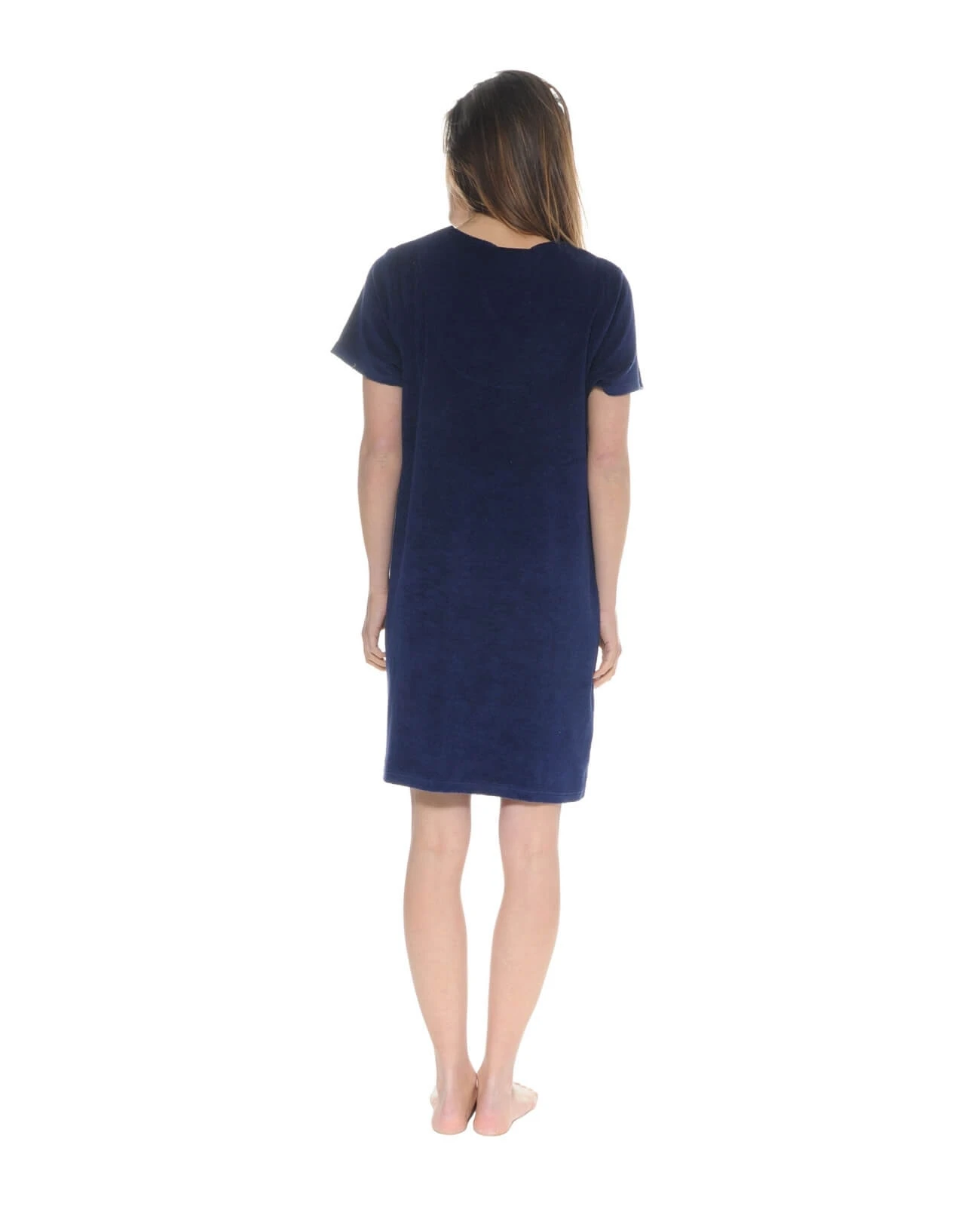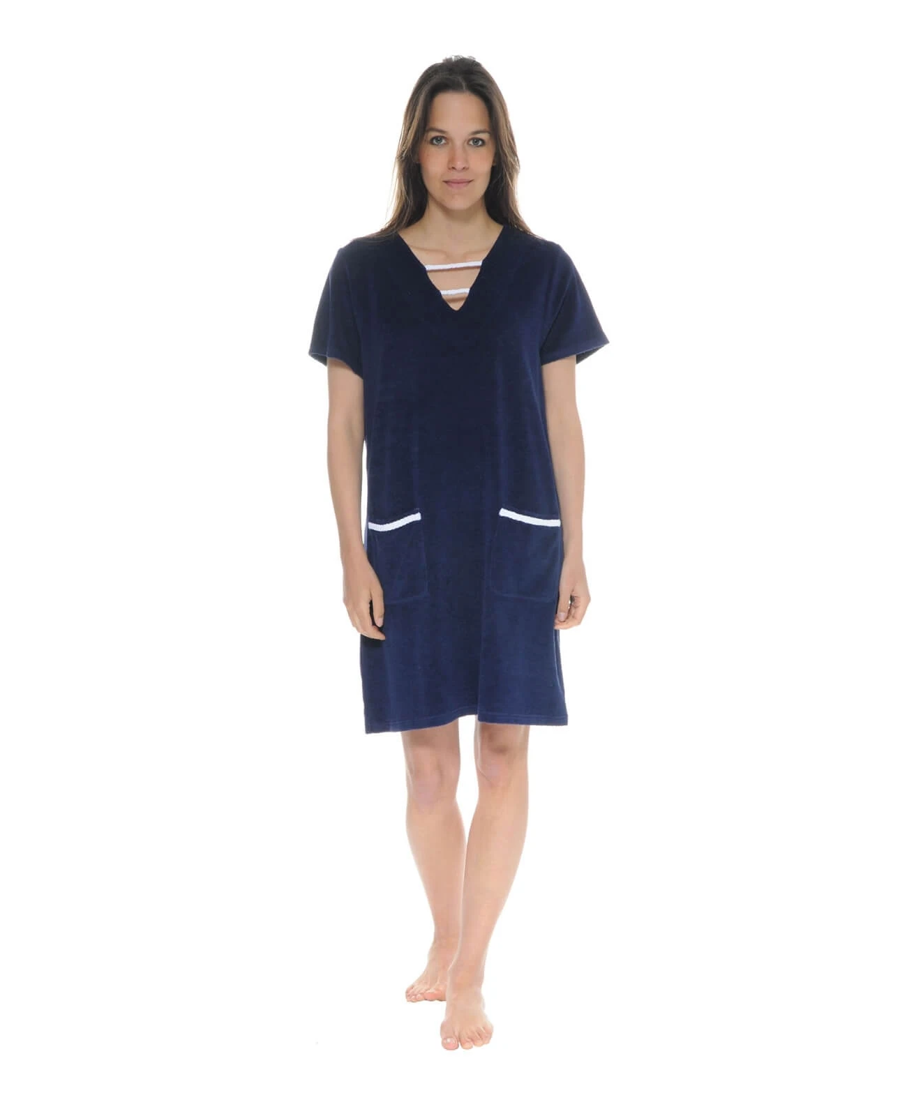 Cest Ă la fois une tenue de dĂ©tente femme mais aussi une robe de nuit. Elle est en effet multi-usage avec sa coupe moderne, sa couleur marine lumineuse, ses deux poches plaquĂ©es sur le devant et sa longueur de 90 centimĂštres. Le col en v profond est ornĂ© dun double passepoil tressĂ© blanc que lon retrouve sur le haut des deux poches. LĂ©gĂšrement cintrĂ©e, elle senfile facilement. La bouclette Ă©ponge fine, 80 % coton et 20 % polyester, procure une agrĂ©able sensation de fraĂźcheur, trĂšs apprĂ©ciĂ©e en plein Ă©tĂ©. Cest la petite robe idĂ©ale Ă mettre dans son sac de voyage pour un week-end de dĂ©tente. La mannequin mesure 1m70 et porte une taille S – Livraison rapide en 48 hrs et toujours les retours gratuits (France mĂ©tropolitaine)