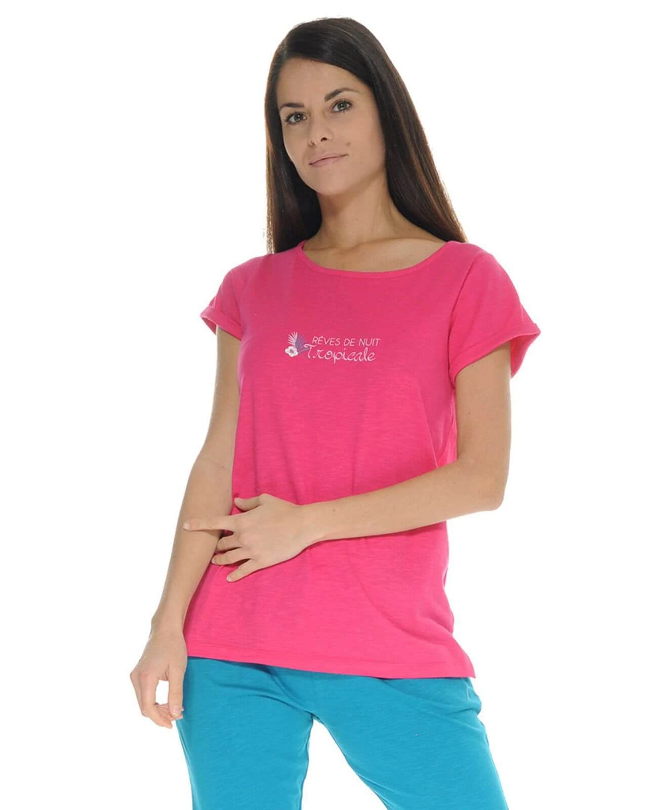 Tee shirt en maille 100% coton flammé, léger comme un voile de douceur sur la peau dans les tons de fuchsia, manches courtes et encolure ronde.