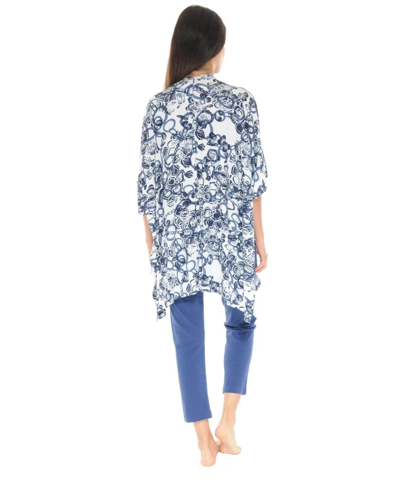 Le poncho porte un imprimé floral sur un thème couleur marine et blanc, des couleurs rafraichissantes pour cet été !