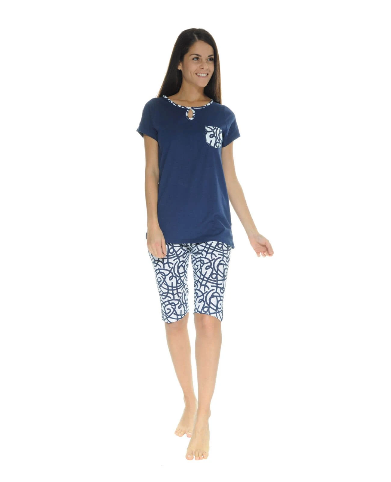 Cet été encore, craquez pour cette association toujours réussie des coloris marine et blanc, notre pyjama Maggie deviendra la pièce phare de vos tenues estivales.