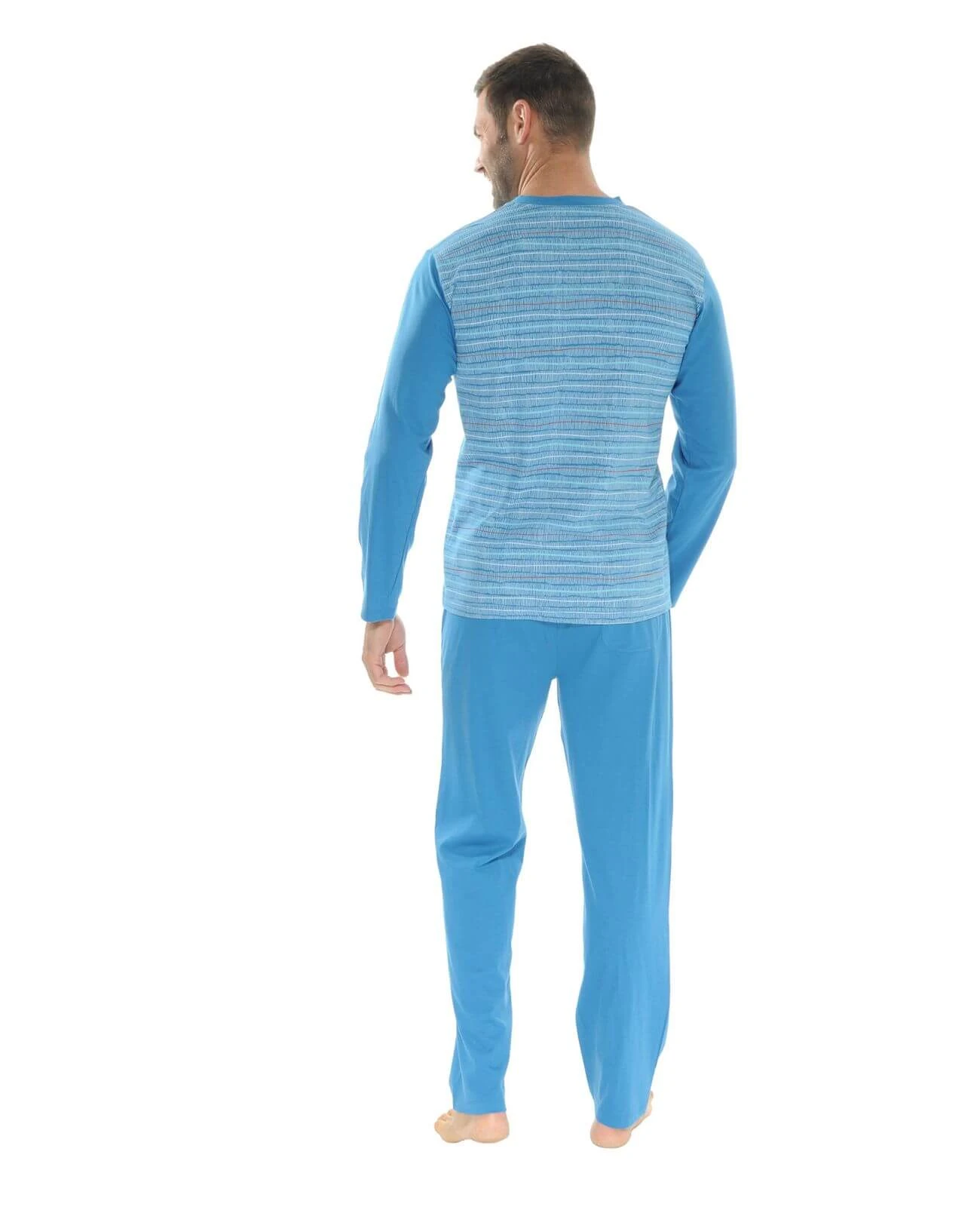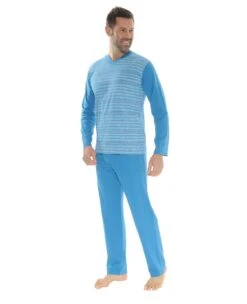 Pyjama tee shirt manches longues en maille de pur coton , une matière douce et souple dans un coloris basique et intemporel, un bleu ciel synonyme de sérénité et fraîcheur qui évoque le ciel , la mer , les grands espaces et les voyages.
