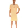 Tee shirt manches courtes , encolure ronde avec ouverture tunisienne par 5 boutons translucides jaunes pour favoriser le passage de la tĂȘte.