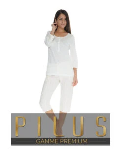 Haut au coloris blanc cassé en maille fine et texturée 100% Coton, une maille naturelle et respirante. Encolure ronde avec ouverture par 4 boutons, manches 3/4 terminées par des poignets rapportés dans le tissu rayé du pantalon.