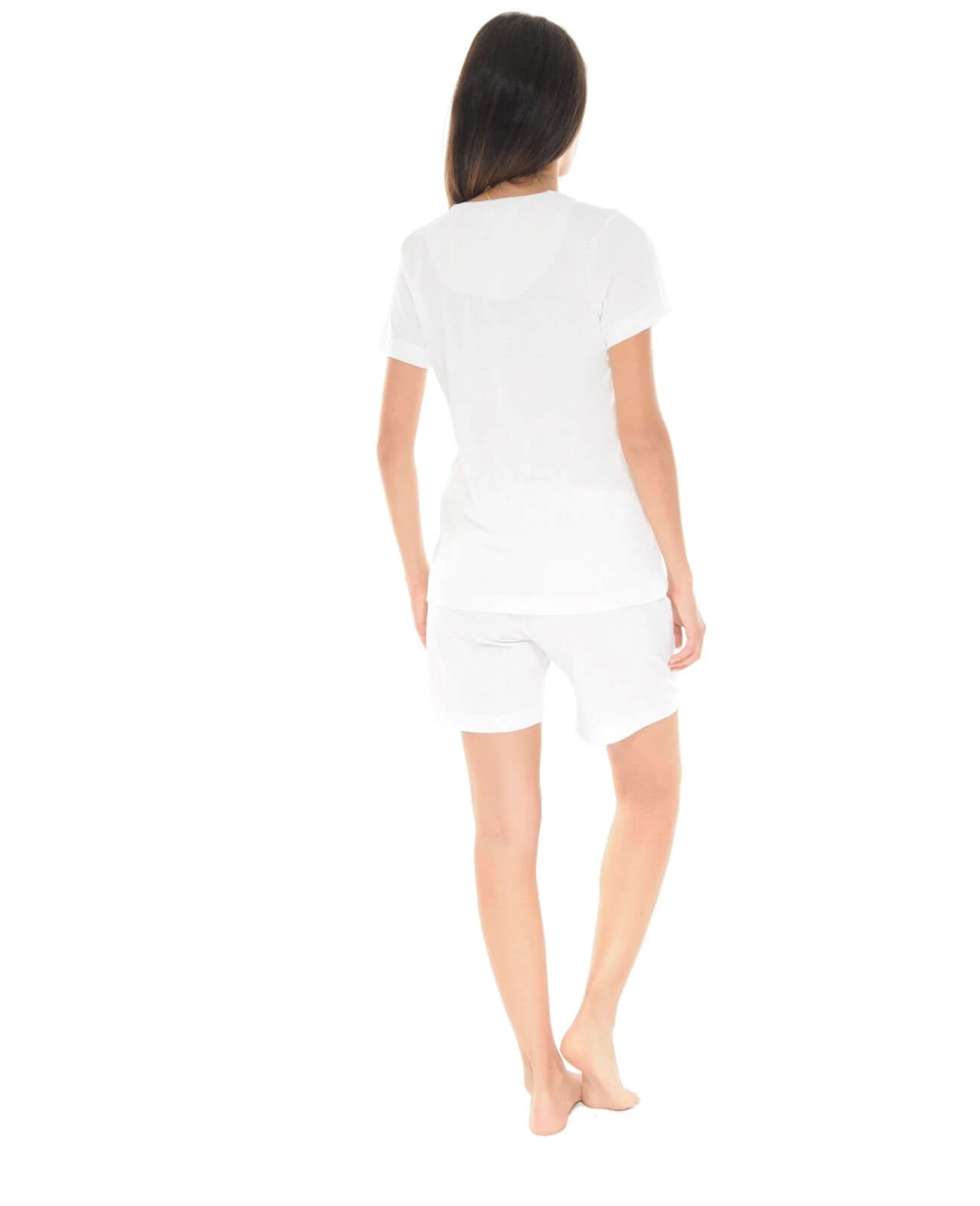 L’ensemble est composĂ© d’un t-shirt Ă manches courtes uni beige et d’un short assorti au t-shirt.