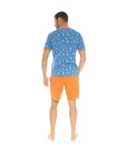 Un t-shirt imprimĂ© d’un motif de mammifères marins sur fond bleu raf rappelant la couleur de la mer et un short orange pour donner un look Ă©nergique Ă l’ensemble !