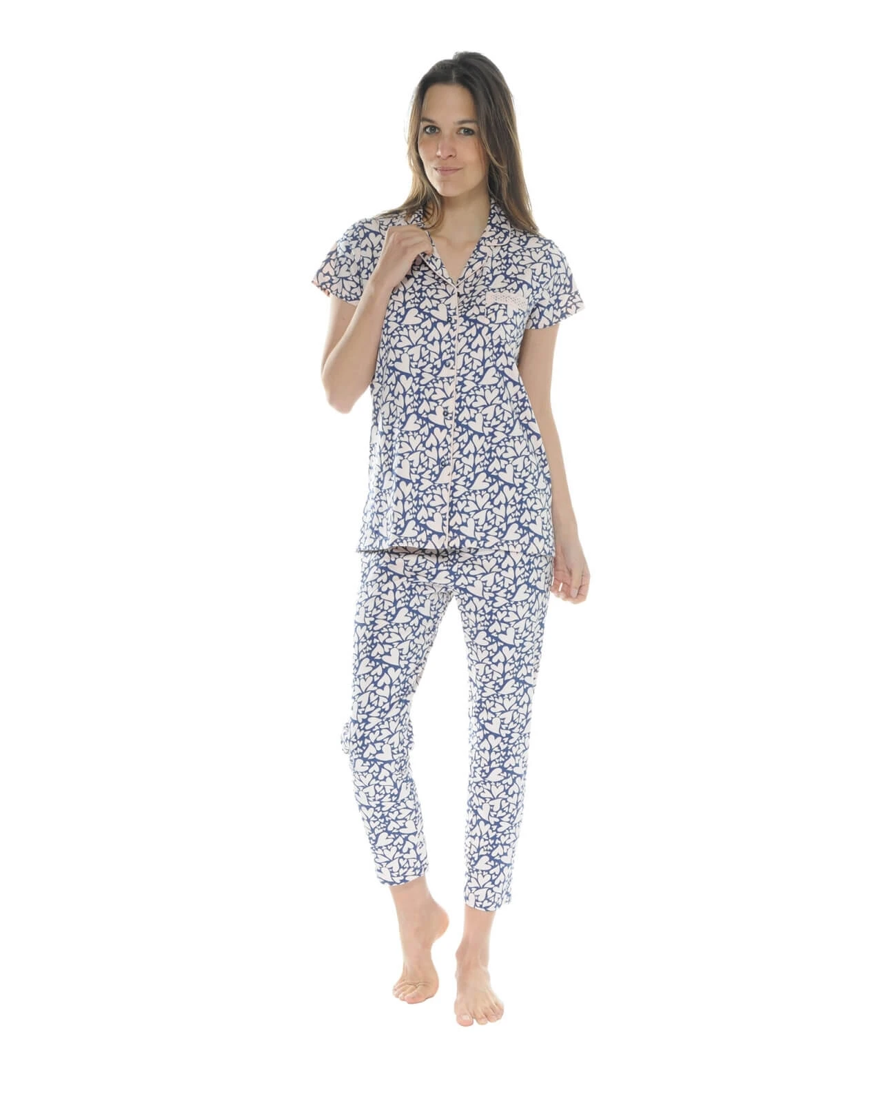 Ensemble pyjama classique et intemporel, haut chemisier, manches courtes entièrement boutonnĂ© en maille jersey 100% coton. Une maille lĂ©gère, douce et respirante très apprĂ©ciĂ©e l Ă©tĂ©. Un imprimĂ© de coeurs dans les tons de rose poudrĂ© pour un ensemble raffinĂ©, plein de fraĂ®cheur. Le haut du pyjama col chemisier est entièrement boutonnĂ© et la poche poitrine se fond dans la fantaisie de l imprimĂ©. Les fentes sur les cĂ´tĂ©s de la veste apportent plus de confort et d aisance. Le corsaire de 76cm coordonnĂ© dans la mĂŞme maille jersey 100% coton s adaptera Ă toutes les morphologies grâce sa ceinture Ă©lastiquĂ©e. La mannequin mesure 1m70 et porte une taille S – Livraison rapide en 48 hrs et toujours les retours gratuits (France mĂ©tropolitaine)