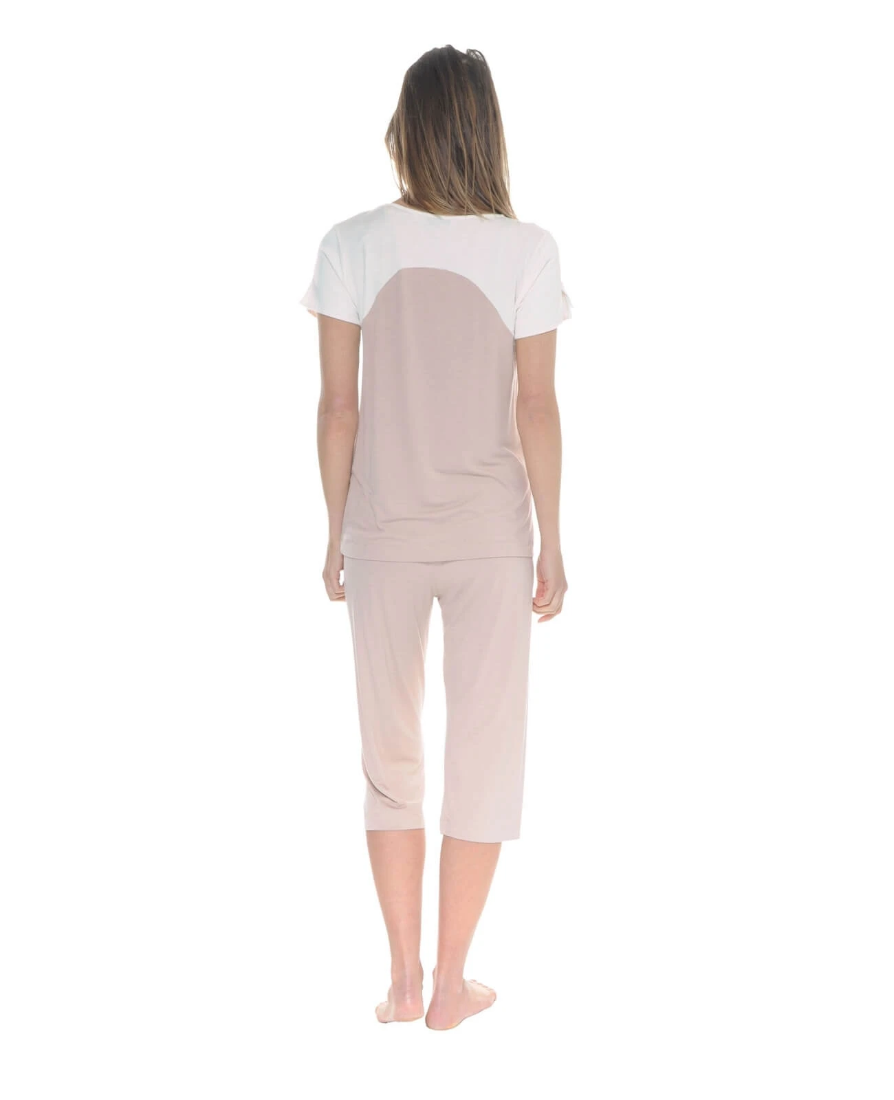 La marque PILUS est présente depuis plus de vingt ans sur les cinq continents dans les plus belles boutiques. Les belles matières, les finitions raffinées et les coupes impeccables, caractérisent cette gamme Premium. ! Coupé dans une maille fluide et souple, une viscose légère et agréable à porter, on craque pour cet ensemble à la couleur douce et sobre, une association d écru et de beige rosé, deux nuances très chics. L originalité de la découpe arrondie sur le devant du tee shirt apporte beaucoup de charme et d élégance au modèle. Pantacourt coordonné de 70cm en maille viscose, au toucher doux, facile à enfiler avec sa taille élastiquée. Une élégance simple et naturelle.