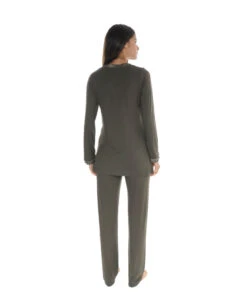 CoupĂ© dans une maille fluide et souple, ce pyjama en viscose Ă©lasthanne est une promesse de douceur, vous apprĂ©cierez le beau tombĂ© de la matiĂšre. On craque sur les finitions Ă©lĂ©gantes et distinguĂ©es. Le col V en satin soulignĂ© d un passepoil blanc apporte une touche de charme et d originalitĂ©. On retrouve cette mĂȘme finition de satin sur la poche poitrine mais aussi au niveau des poignets ornĂ©s d un passepoil blanc. Le pantalon en maille viscose Ă la ceinture Ă©lastiquĂ©e, ultra fĂ©minin, mettra en valeur votre silhouette grĂące Ă sa ceinture rapportĂ©e en satin. CĂŽtĂ© couleur, le vert kaki chaleureux et lumineux est une invitation au cocoon. JAYNE, un pyjama moderne et unique. Pour un look cool chic, complĂ©tez votre tenue avec notre kimono satinĂ© JAYNE 61575. La mannequin mesure 1m70 et porte une taille S – Livraison rapide en 48 hrs et toujours les retours gratuits (France mĂ©tropolitaine)
