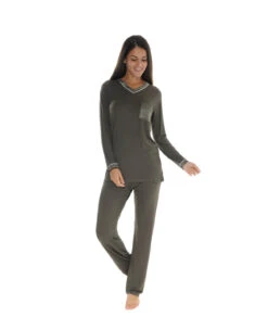 CoupĂ© dans une maille fluide et souple, ce pyjama en viscose Ă©lasthanne est une promesse de douceur, vous apprĂ©cierez le beau tombĂ© de la matiĂšre. On craque sur les finitions Ă©lĂ©gantes et distinguĂ©es. Le col V en satin soulignĂ© d un passepoil blanc apporte une touche de charme et d originalitĂ©. On retrouve cette mĂȘme finition de satin sur la poche poitrine mais aussi au niveau des poignets ornĂ©s d un passepoil blanc. Le pantalon en maille viscose Ă la ceinture Ă©lastiquĂ©e, ultra fĂ©minin, mettra en valeur votre silhouette grĂące Ă sa ceinture rapportĂ©e en satin. CĂŽtĂ© couleur, le vert kaki chaleureux et lumineux est une invitation au cocoon. JAYNE, un pyjama moderne et unique. Pour un look cool chic, complĂ©tez votre tenue avec notre kimono satinĂ© JAYNE 61575. La mannequin mesure 1m70 et porte une taille S – Livraison rapide en 48 hrs et toujours les retours gratuits (France mĂ©tropolitaine)