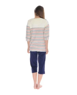 Un esprit marin revisitĂ© dans les tons de marine rouge sur fond Ă©cru pour une nouvelle façon de vivre des moments de dĂ©tente Ă la maison. Tee shirt en bouclette Ă©ponge au dĂ©colletĂ© rond, manches aux coudes, fantaisie dune patte Ă©paulette de couleur rouge sur les Ă©paules, deux poches Ă©crues sur le devant. La ligne est droite et facile Ă porter, les rayures marines et rouges sur fond Ă©cru sharmonisent avec le coloris marine du corsaire de 76cm en bouclette Ă©ponge et Ă la taille Ă©lastiquĂ©e. Rappel du coloris du haut grĂące Ă la fausse patte de boutonnage agrĂ©mentĂ©e de 3 boutons sur le bas du corsaire. La mannequin mesure 1m70 et porte une taille S – Livraison rapide en 48 hrs et toujours les retours gratuits (France mĂ©tropolitaine)