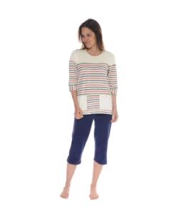 Un esprit marin revisitĂ© dans les tons de marine rouge sur fond Ă©cru pour une nouvelle façon de vivre des moments de dĂ©tente Ă la maison. Tee shirt en bouclette Ă©ponge au dĂ©colletĂ© rond, manches aux coudes, fantaisie dune patte Ă©paulette de couleur rouge sur les Ă©paules, deux poches Ă©crues sur le devant. La ligne est droite et facile Ă porter, les rayures marines et rouges sur fond Ă©cru sharmonisent avec le coloris marine du corsaire de 76cm en bouclette Ă©ponge et Ă la taille Ă©lastiquĂ©e. Rappel du coloris du haut grĂące Ă la fausse patte de boutonnage agrĂ©mentĂ©e de 3 boutons sur le bas du corsaire. La mannequin mesure 1m70 et porte une taille S – Livraison rapide en 48 hrs et toujours les retours gratuits (France mĂ©tropolitaine)