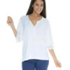 Un délicat décolleté en macramé orné de 6 boutons discrets, macramé qui fait aussi le charme du bas des manches.
