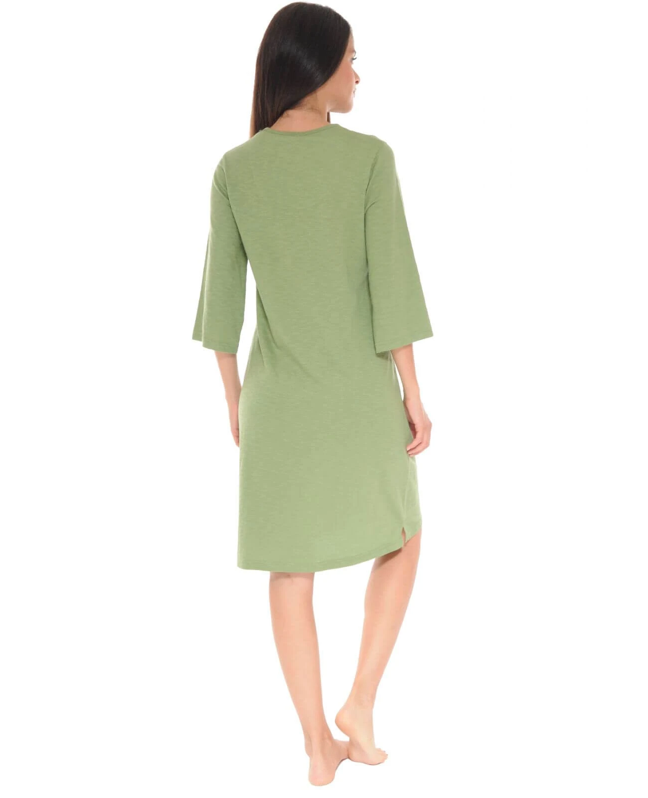 Cette robe est parĂ©e d’une couleur kaki toujours trĂšs apprĂ©ciĂ©e, ainsi que d’un col rond avec possibilitĂ© d’ouverture par un bouton.