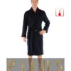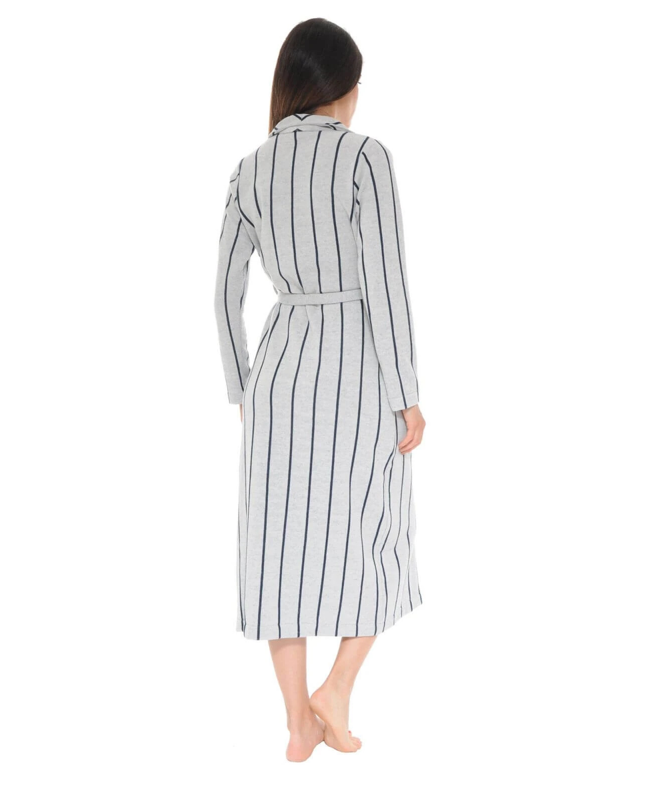 Ce peignoir Ă rayures bleues marines sur fond gris clair, dispose d’un col châle, d’une ceinture amovible sous passants afin de l’ajuster selon votre morphologie, et de deux grandes poches sur le cĂ´tĂ©.